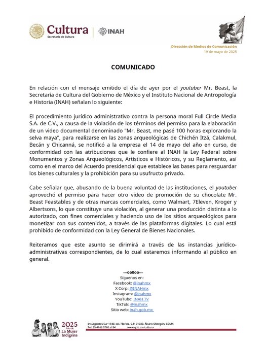 El INAH y la Secretaría de Cultura expresaron que el procedimiento jurídico administrativo en contra de la persona moral Full Circle Media SA de CV , a causa de no respetar los términos del permiso para el documental Mr. Beast, me pasé 100 horas explorando la selva maya , se notificó a la empresa el pasado 14 de mayo.