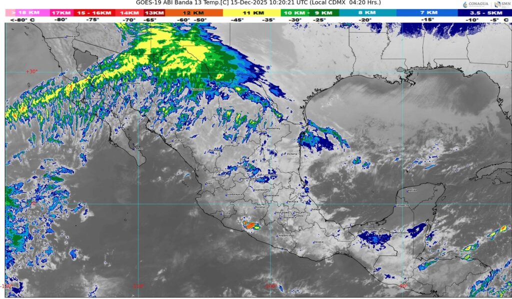 Asimismo, la masa de aire polar asociada al frente ocasionará descenso de la temperatura en zonas de la Mesa del Norte y la Mesa Central, así como viento de componente norte con rachas de 70 a 90 kilómetros por hora (km/h) en el istmo y golfo de Tehuantepec (Oaxaca y Chiapas); con rachas de 50 a 70 km/h en las costas de Tamaulipas y Veracruz; y con rachas de 30 a 50 km/h en costas de Tabasco, Campeche, Yucatán y Quintana Roo; además de oleaje elevado en las costas de las mencionadas entidades.