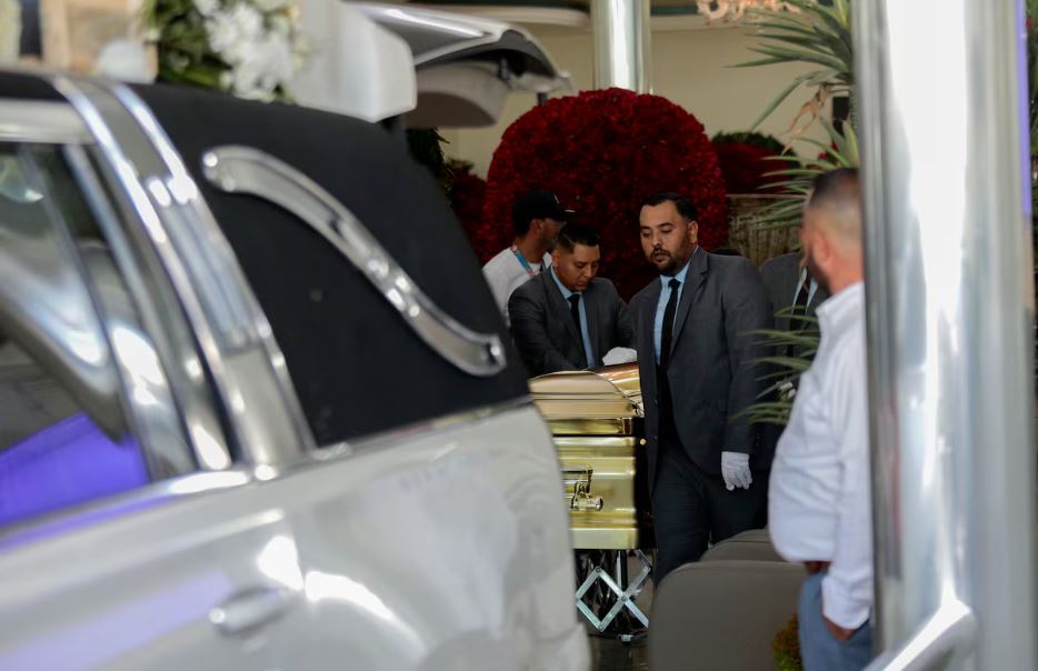 El cortejo salió a las 11:15 horas de Funerales La Paz, en la colonia San Andrés. Dos carrozas encabezaron el trayecto: la blanca con el cuerpo y una dorada en la que viajaba un gallo monumental elaborado con flores rojas y plumas, además de otro arreglo floral de rosas rojas que en la funeraria portaba un listón con las siglas del CJNG.